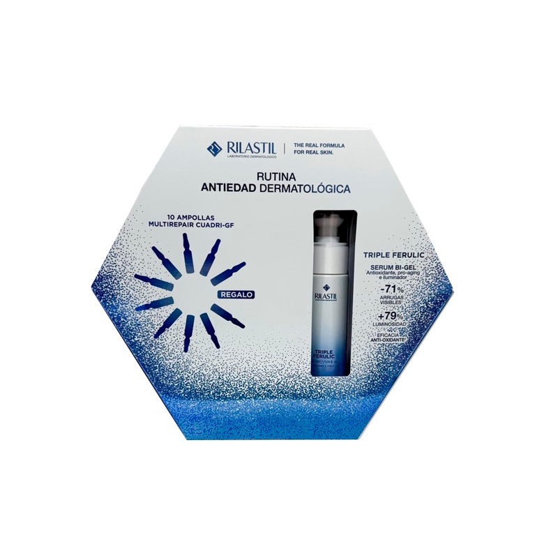 El Rutina Antiedad Rilastil Triple Ferulic Sérum (30ml) + 10 Ampollas Cuadri-GF es un tratamiento intensivo y completo diseñado para un efecto antiedad global y una defensa antioxidante superior.